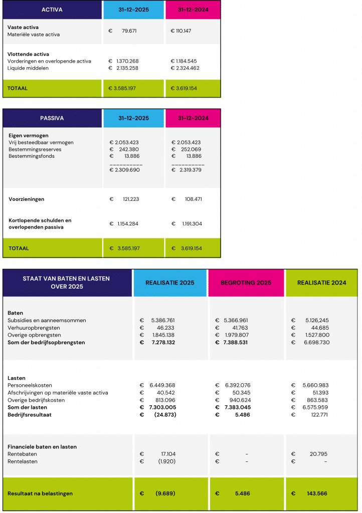 Waar over het jaar 2025 sprake is van een tekort of overschot op de subsidie inkomsten is hiermee rekening gehouden in de jaarrekening als terugbetalingsverplichting en daar waar mogelijk een verrekening met een egalisatiereserve van de betreffende opdrachtgevers.