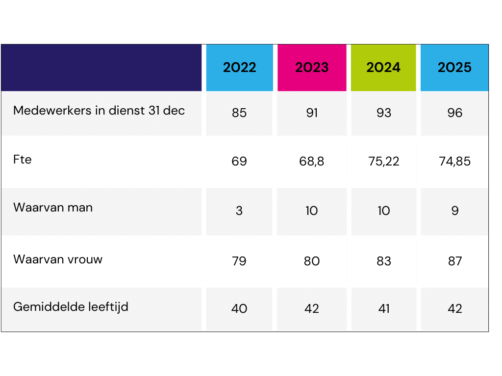 Op 31 december 2025 bestond onze organisatie uit 96 medewerkers (exclusief 4 stagiaires), goed voor 74,85 fte. De personeelsopbouw kent een duidelijke vrouwelijke meerderheid, met 87 vrouwen en 9 mannen in dienst. De gemiddelde leeftijd van medewerkers is 42 jaar, wat duidt op een evenwichtige mix tussen ervaren professionals en medewerkers die zich verder binnen de organisatie ontwikkelen.